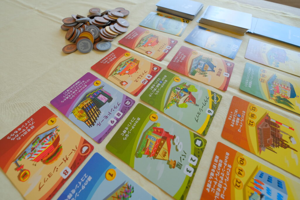 サイコロの運要素とカード選びや資金計画の奥深さを楽しみながら、親子でじっくり遊べるやりごたえのある街づくりゲームです。