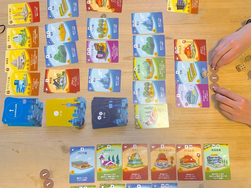 「街コロ通」では、ランドマークを先に3つ建てると勝ちです。