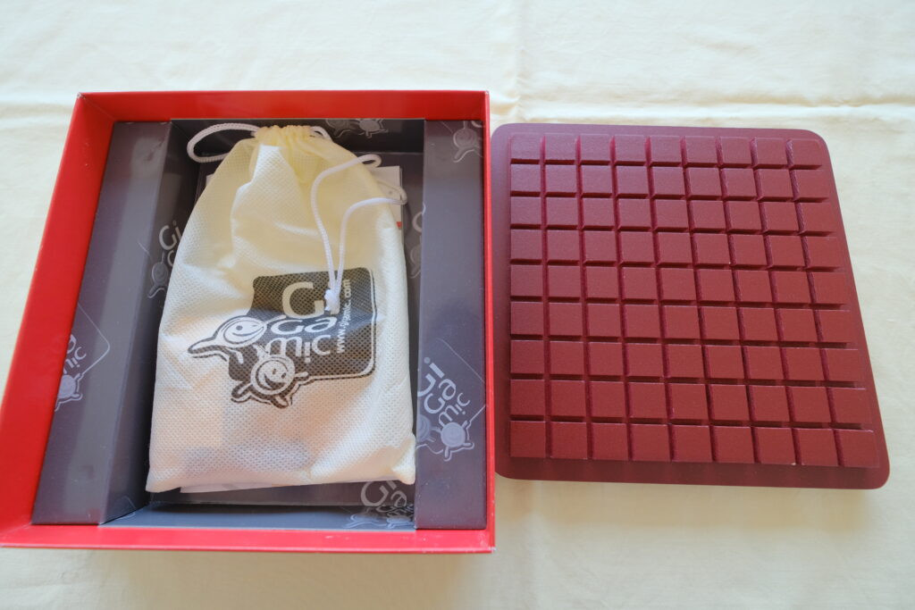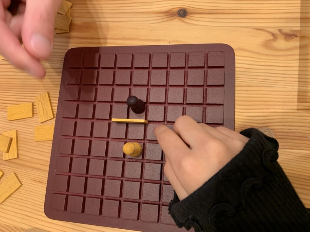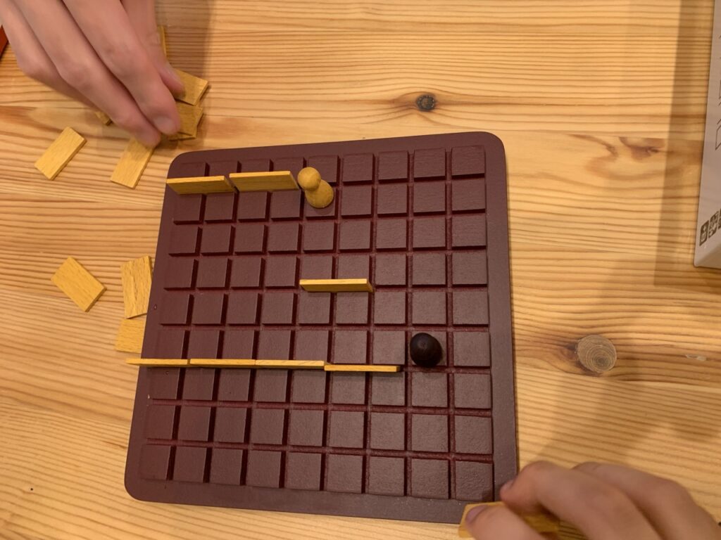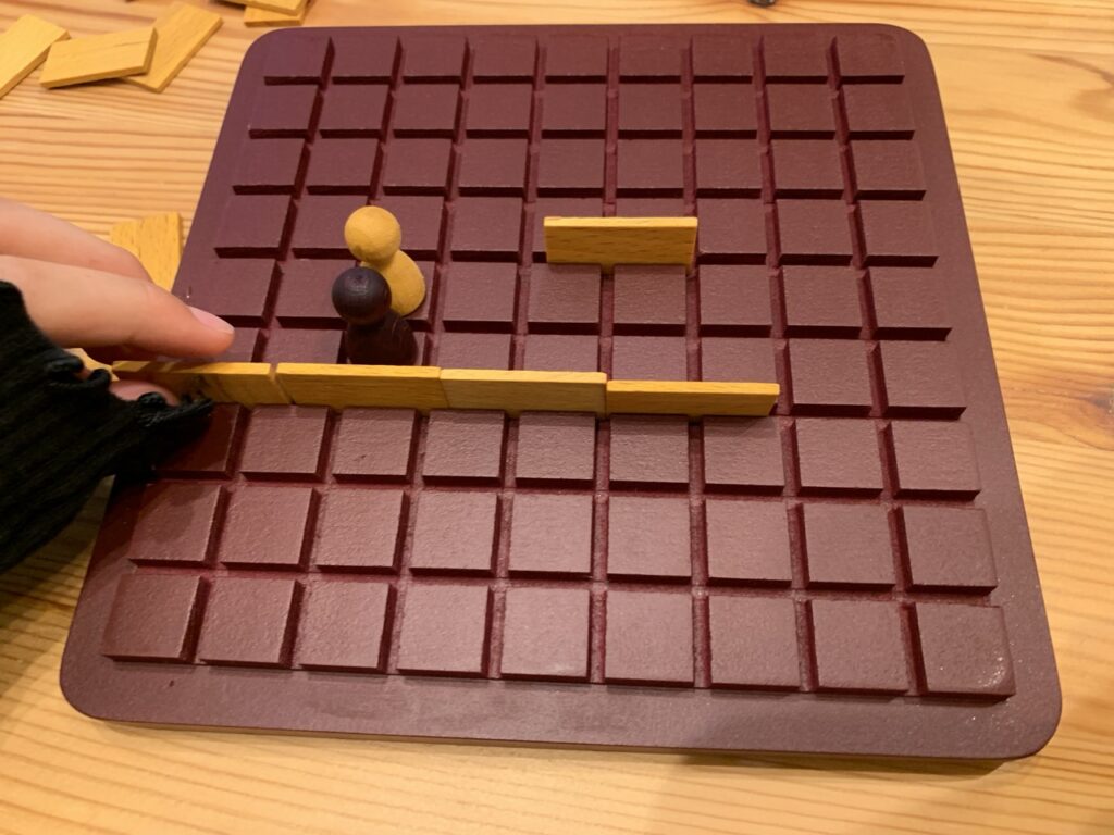 小さな盤面上を前後左右に動かしながら、相手を妨害する壁を立てるだけの簡単ルール。